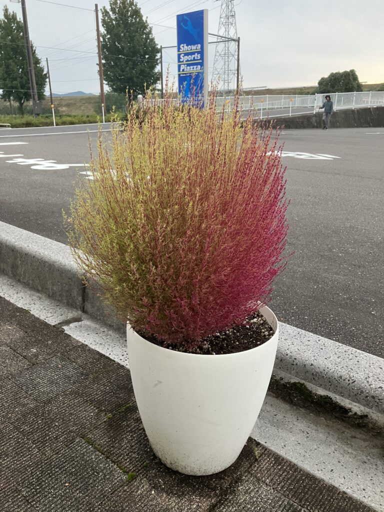 夏の間は爽やかな黄緑色をしていたコキアが、気温の低下とともに少しずつ色づき、やがて燃えるような赤へと変化していきます。